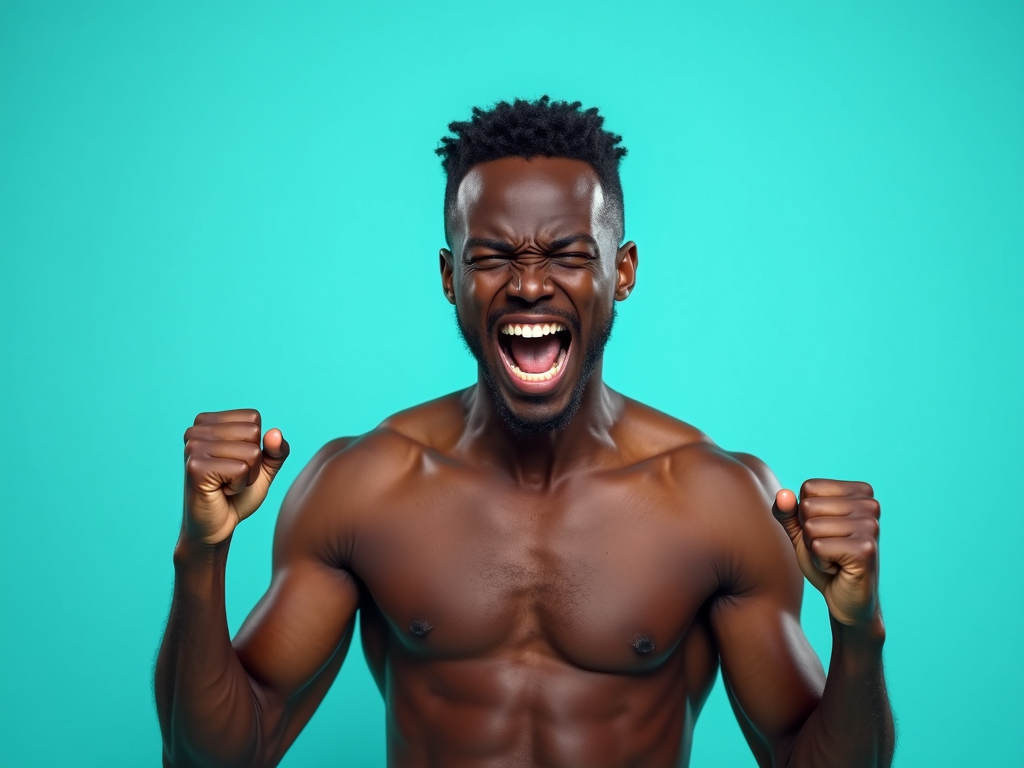 the image is a vibrant and colorful thumbnail, typically used for a youtube video. model with clenched fists and angry face, bright plain cyan background