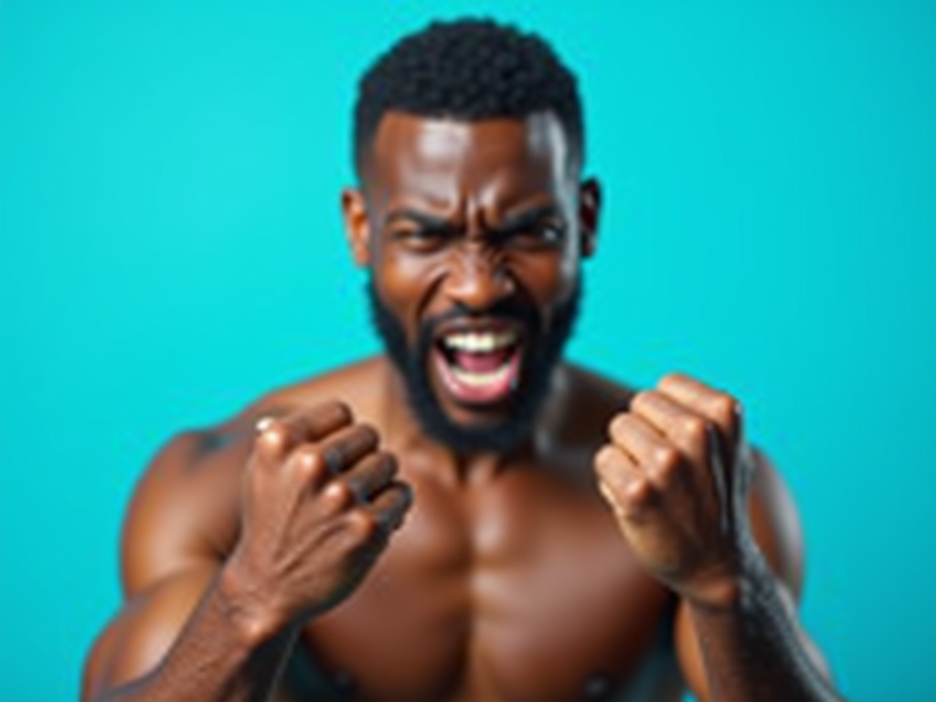 the image is a vibrant and colorful thumbnail, typically used for a youtube video. model with clenched fists and angry face, bright plain cyan background