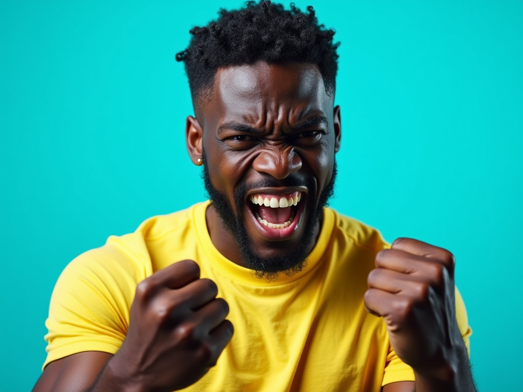 the image is a vibrant and colorful thumbnail, typically used for a youtube video. model with clenched fists and angry face, bright plain cyan background