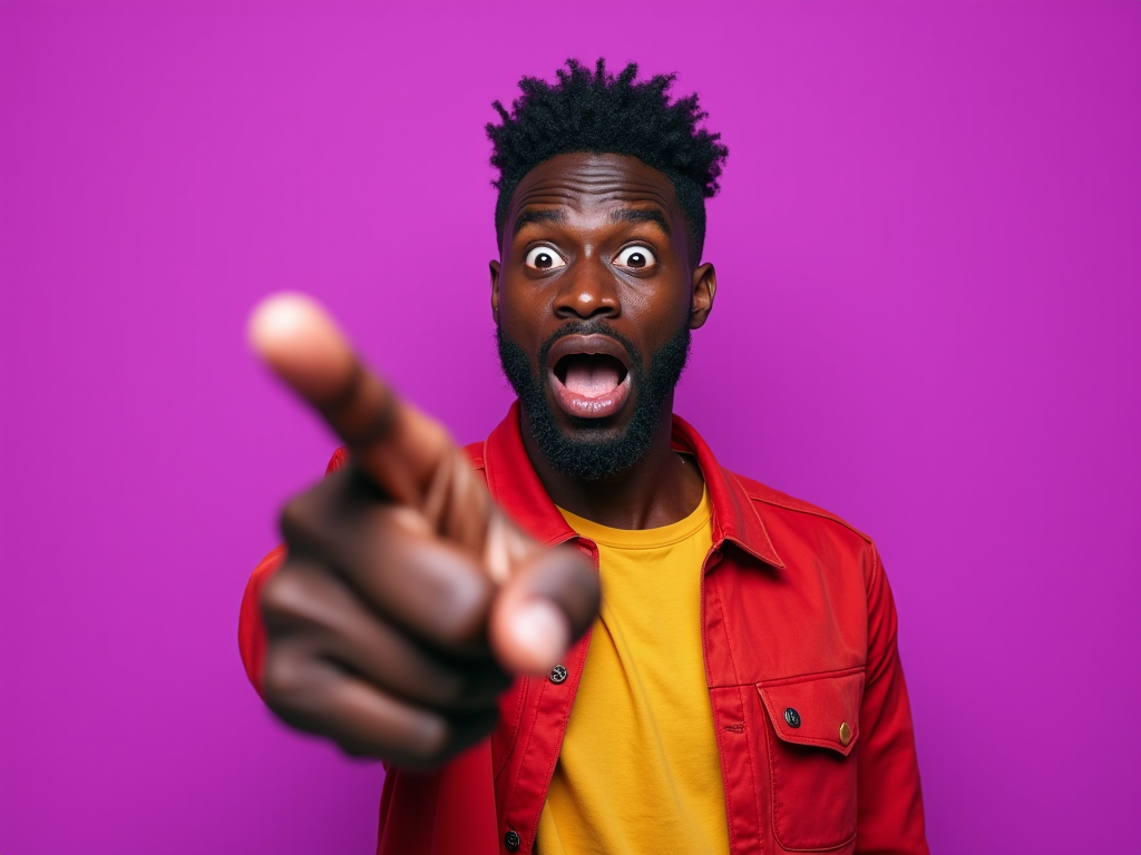 the image is a vibrant and colorful thumbnail, typically used for a youtube video. model pointing at something with surprised face, bright plain purple background