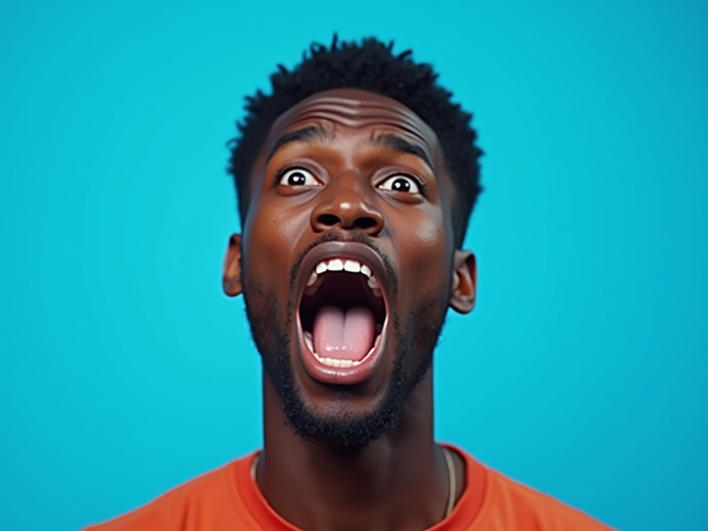 the image is a vibrant and colorful thumbnail, typically used for a youtube video. model with mouth wide open screaming yelling shouting, bright plain blue background