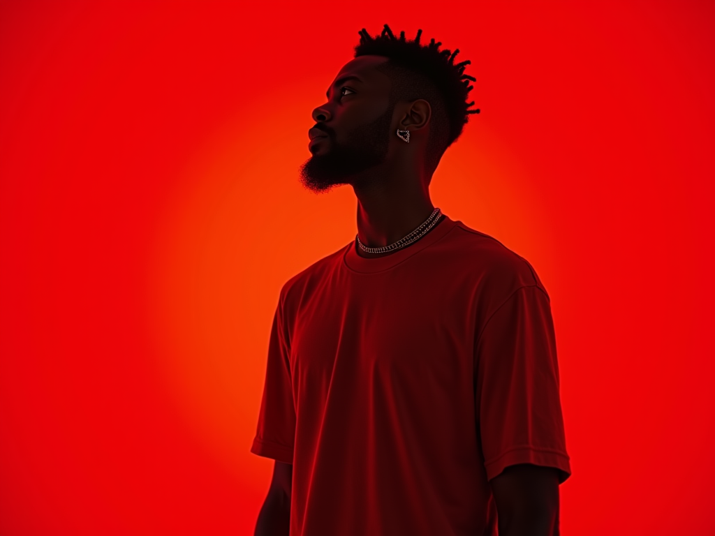 the image is a vibrant and colorful thumbnail, typically used for a youtube video. looking away, looking aside, gazing off model, bright plain red background