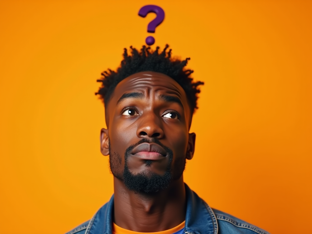 the image is a vibrant and colorful thumbnail, typically used for a youtube video. model with confused puzzled expression, question mark above head, bright plain brown background