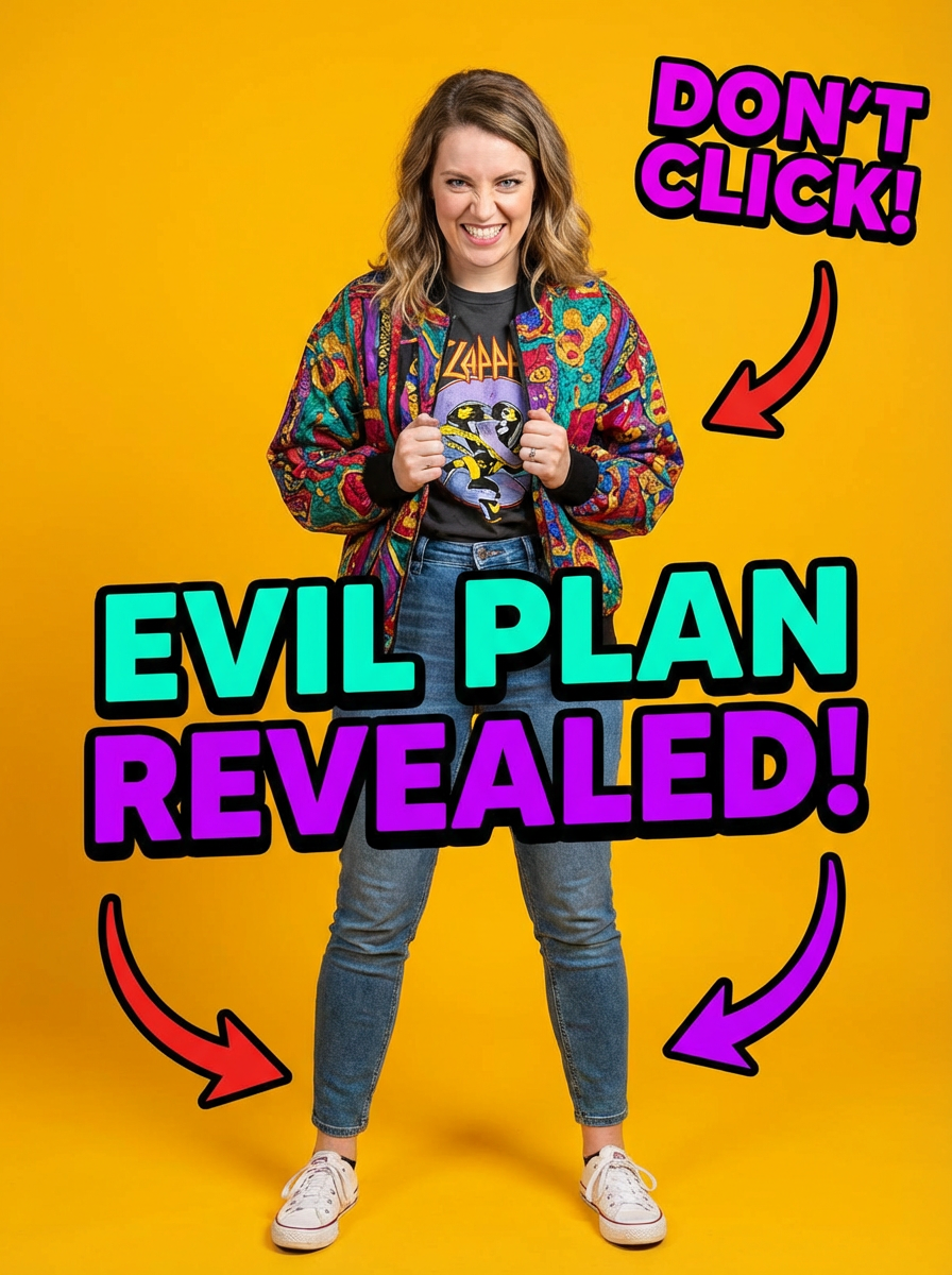 the image is a vibrant and colorful thumbnail, typically used for a youtube video. model with evil grin and mischievous look, bright plain gold background