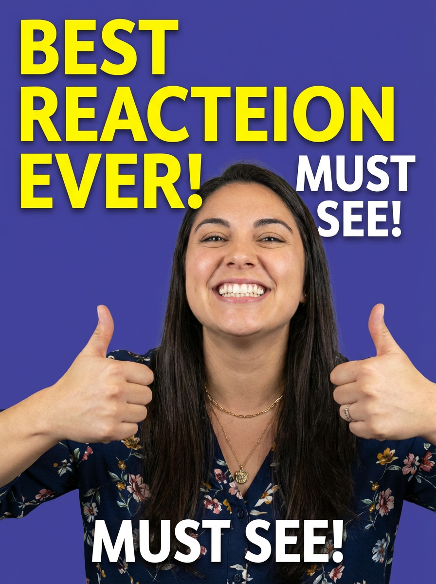 the image is a vibrant and colorful thumbnail, typically used for a youtube video. model with wide smile and thumbs up, positive reaction, bright plain indigo background