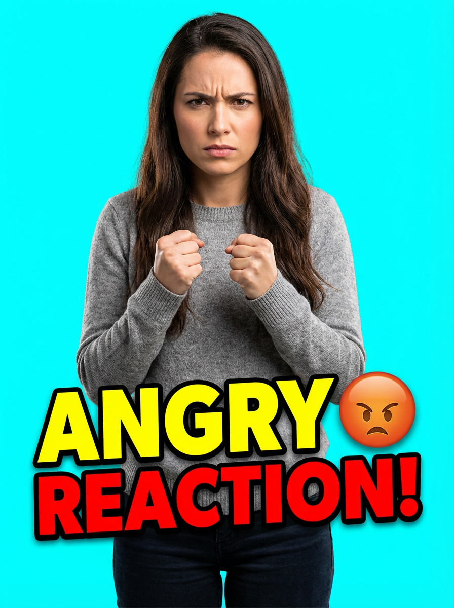 the image is a vibrant and colorful thumbnail, typically used for a youtube video. model with clenched fists and angry face, bright plain cyan background