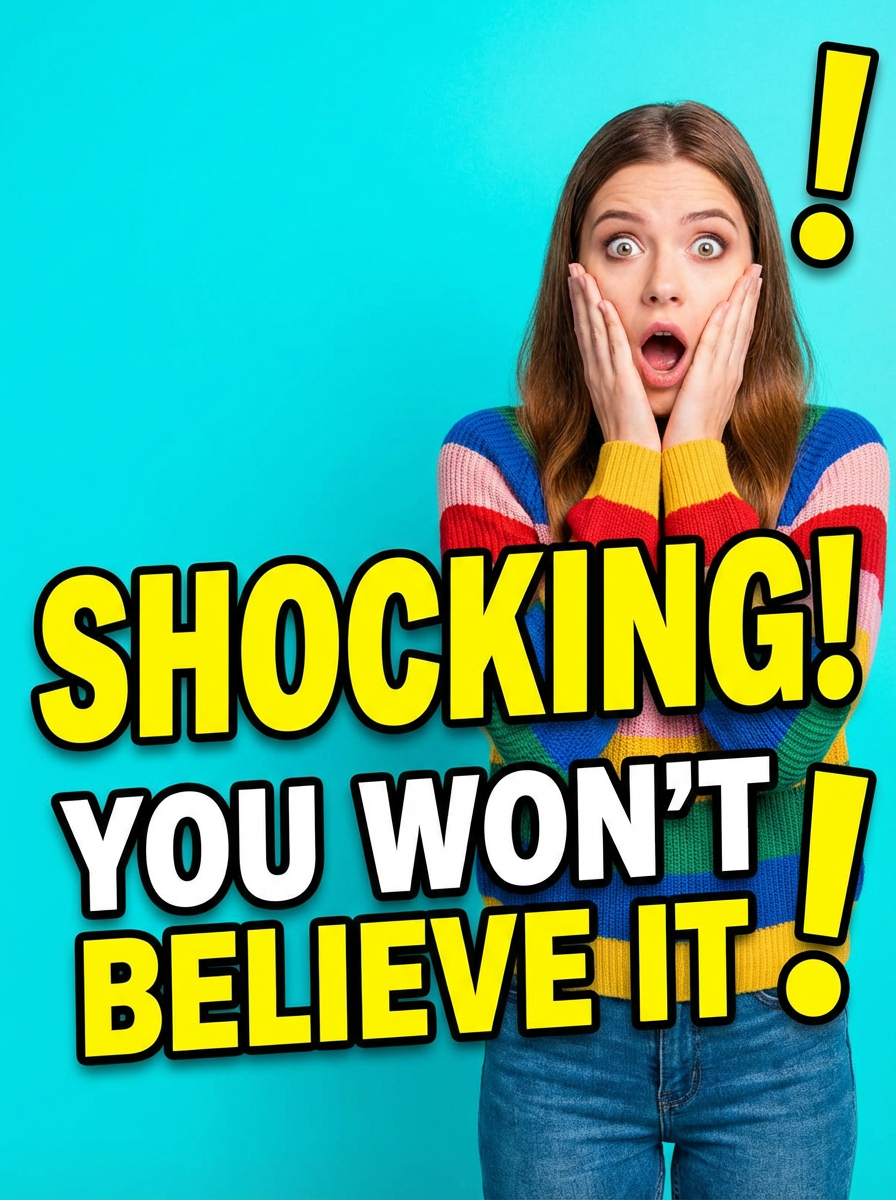 the image is a vibrant and colorful thumbnail, typically used for a youtube video. exaggerated surprised shocked shock astonished startled stunned surprise model, bright plain cyan background