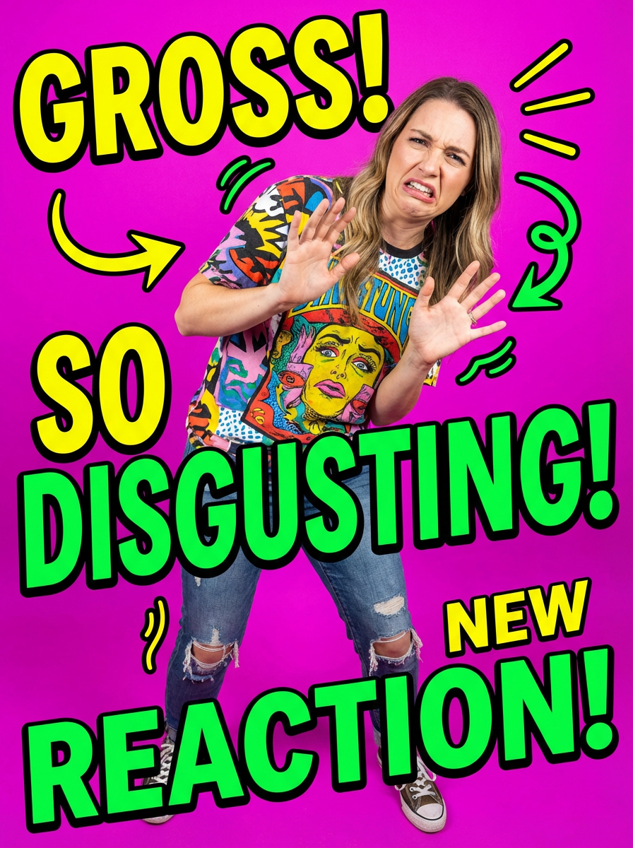 the image is a vibrant and colorful thumbnail, typically used for a youtube video. exaggerated feels disgusted repulsed revolted nauseated sickened appalled horrified model, bright plain magenta background