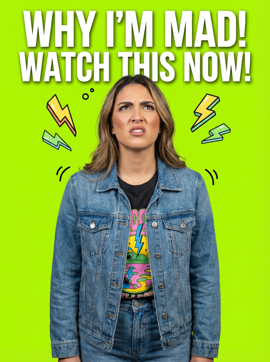 the image is a vibrant and colorful thumbnail, typically used for a youtube video. model looking up with angry expression, bright plain green background