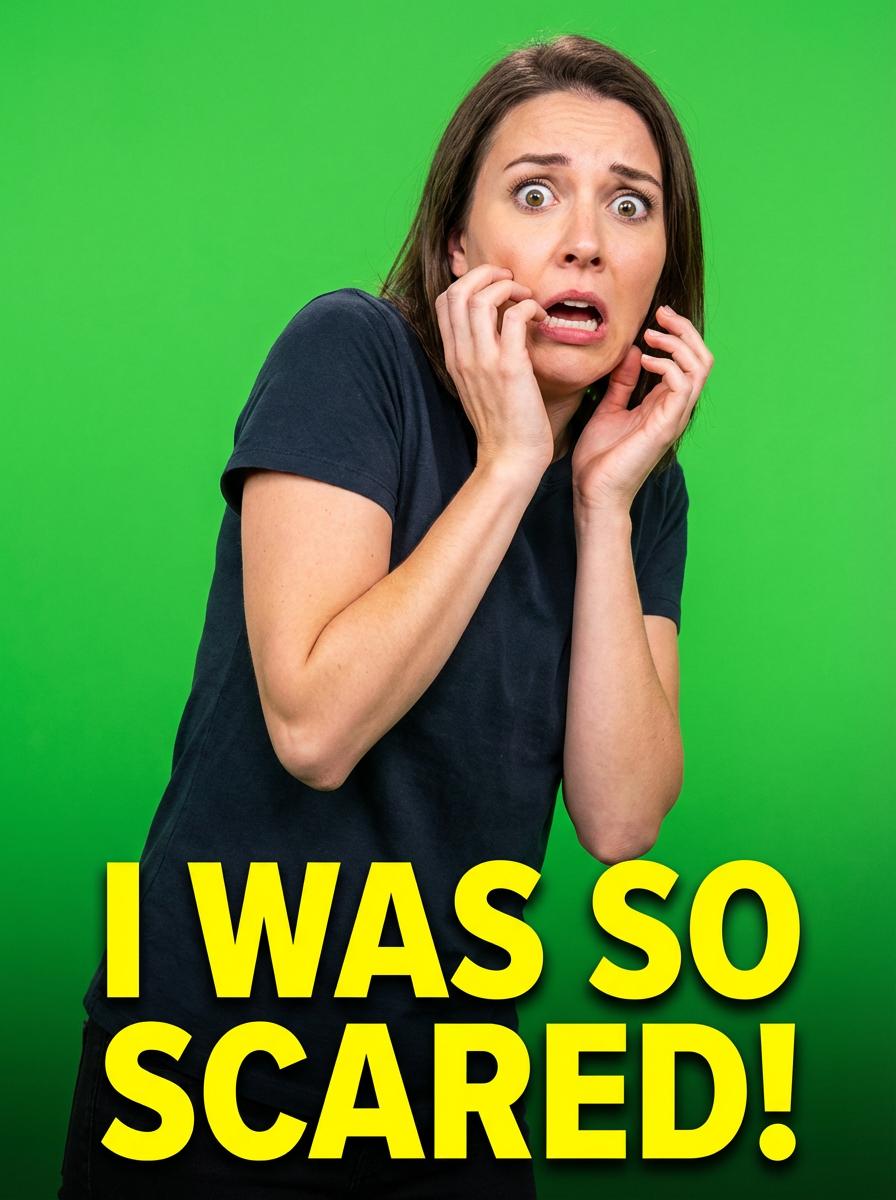 the image is a vibrant and colorful thumbnail, typically used for a youtube video. exaggerated scared shocked afraid frightened terrified anxious model, bright plain green background