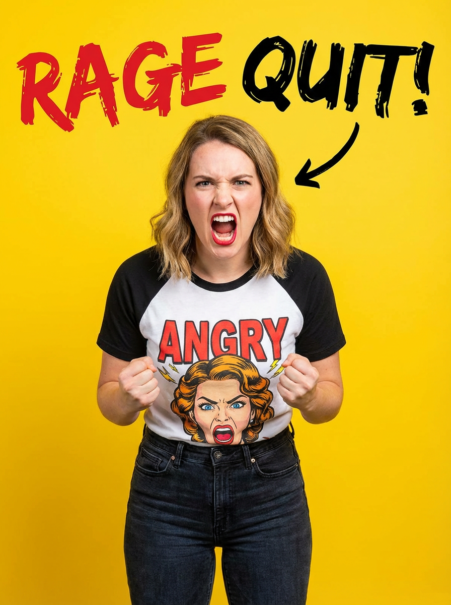 the image is a vibrant and colorful thumbnail, typically used for a youtube video. exaggerated angry furious rage model, bright plain yellow background