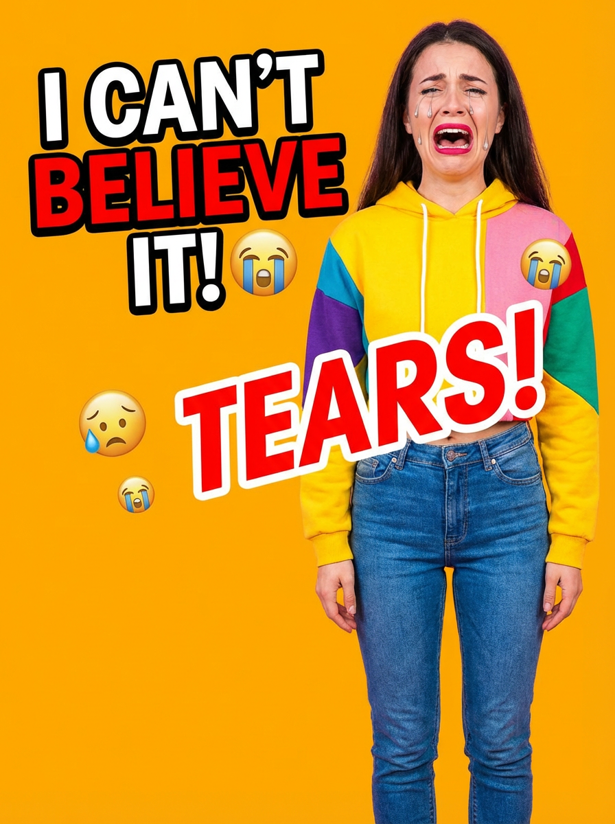 the image is a vibrant and colorful thumbnail, typically used for a youtube video. exaggerated crying model, bright plain orange background