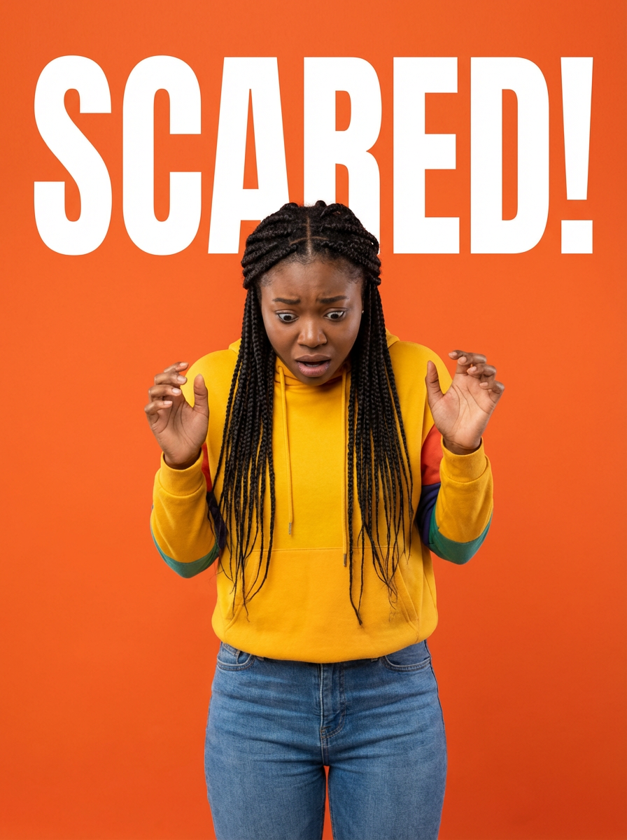 the image is a vibrant and colorful thumbnail, typically used for a youtube video. model looking down with scared face, bright plain orange background