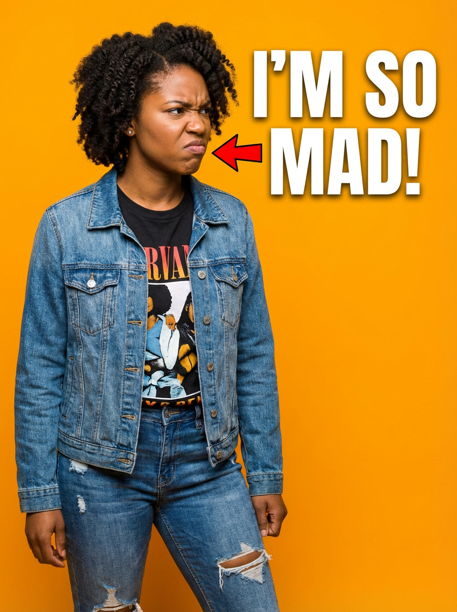 the image is a vibrant and colorful thumbnail, typically used for a youtube video. model looking left with angry expression, bright plain orange background