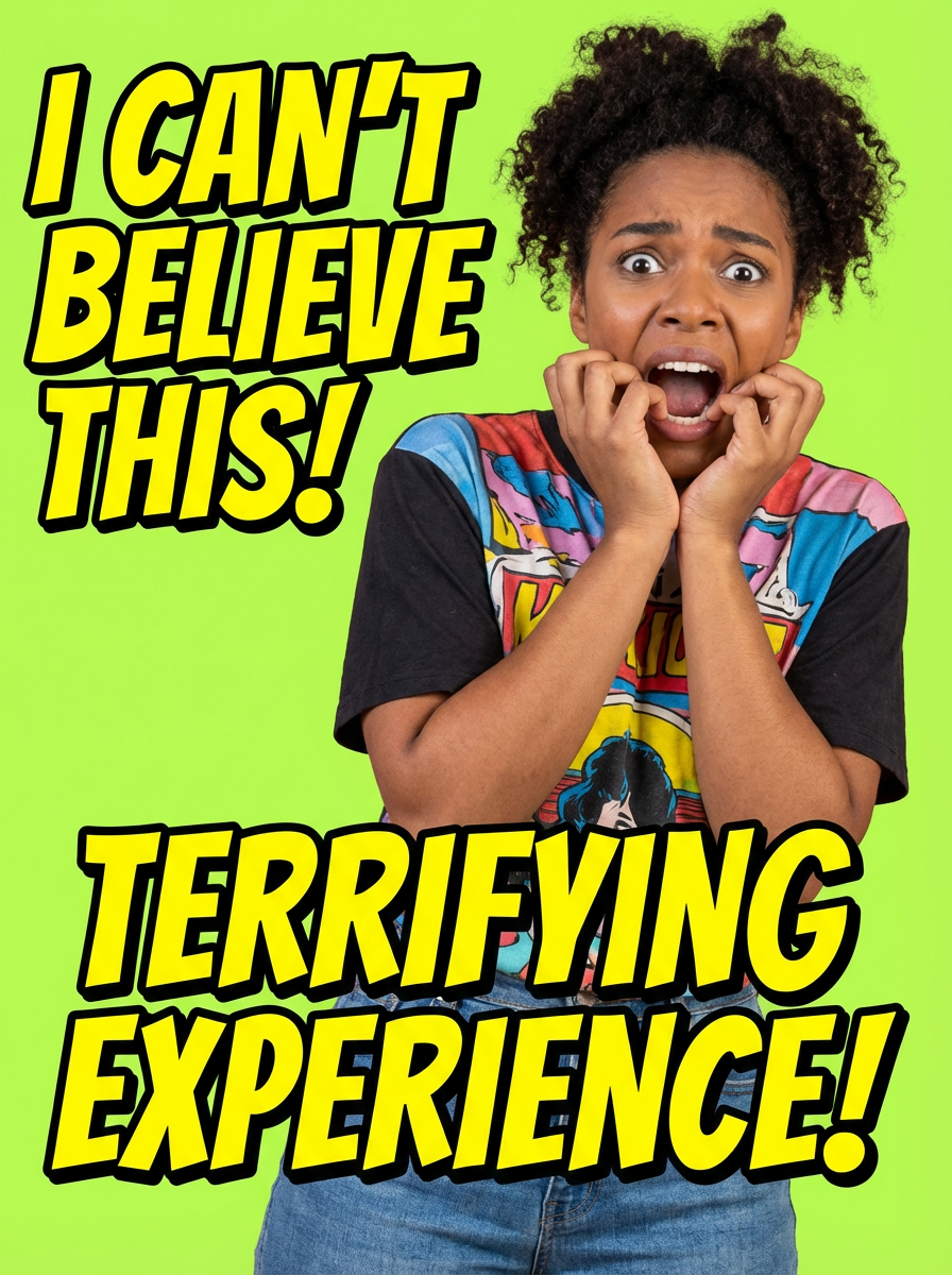 the image is a vibrant and colorful thumbnail, typically used for a youtube video. exaggerated scared shocked afraid frightened terrified anxious model, bright plain green background