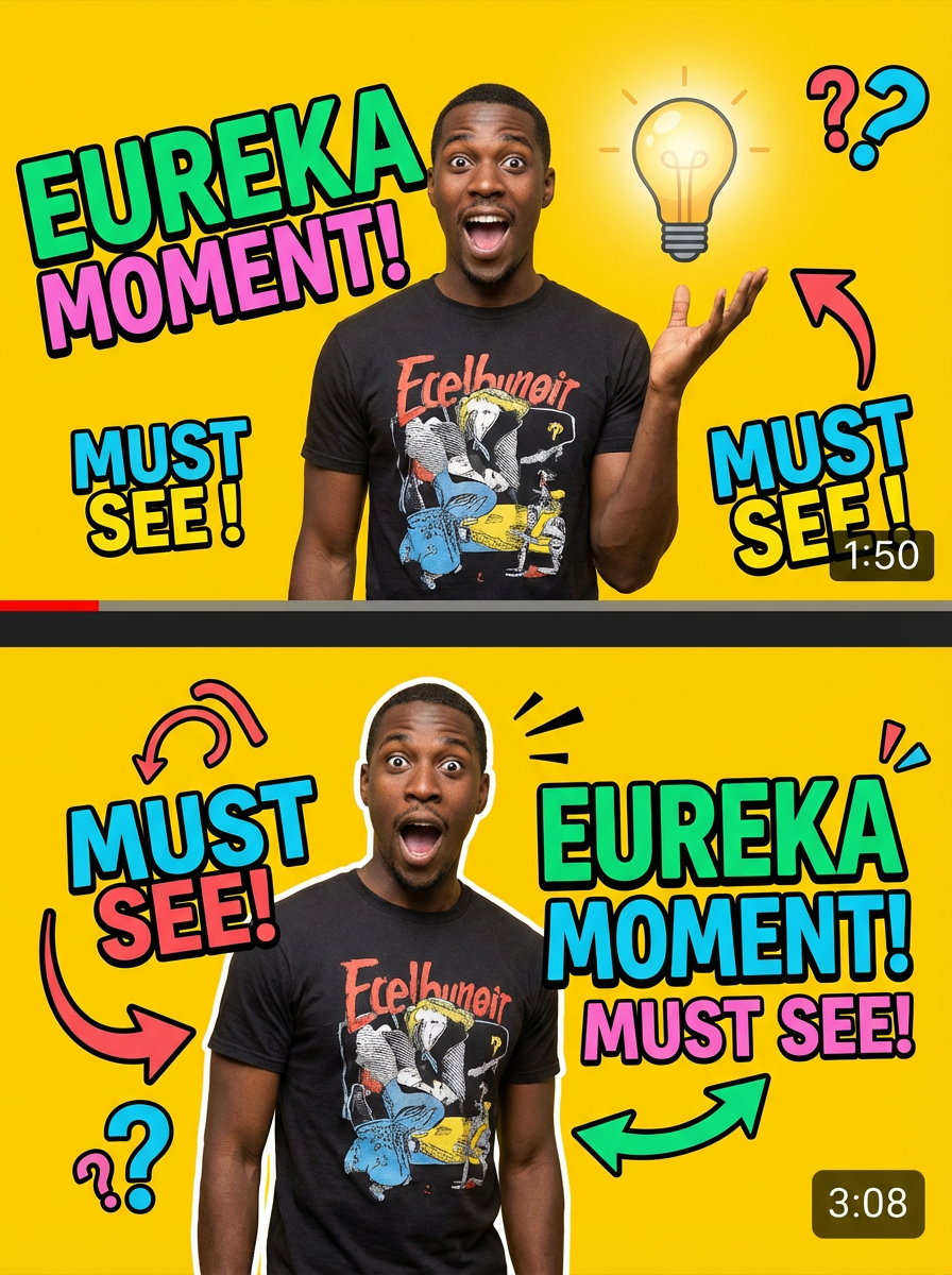the image is a vibrant and colorful thumbnail, typically used for a youtube video. model with eureka expression, light bulb above head, bright plain yellow background