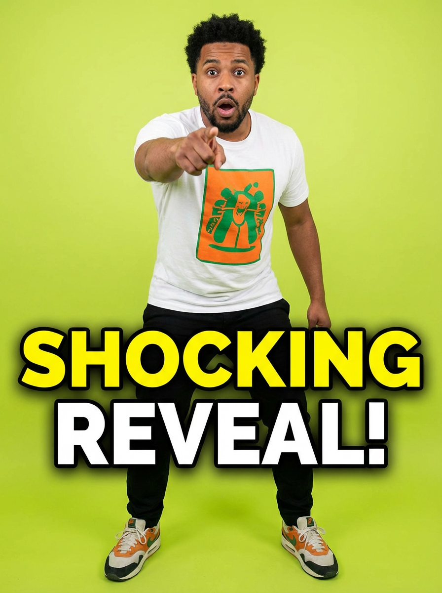 the image is a vibrant and colorful thumbnail, typically used for a youtube video. model with finger pointing at camera, dramatic pose, bright plain lime background