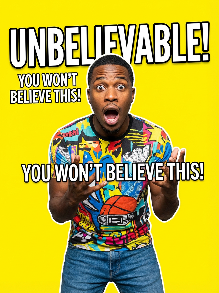 the image is a vibrant and colorful thumbnail, typically used for a youtube video. model with raised eyebrows and wide eyes, shocked expression, bright plain yellow background