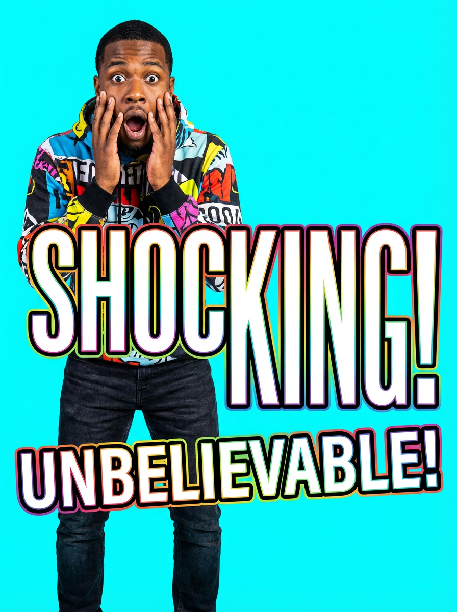 the image is a vibrant and colorful thumbnail, typically used for a youtube video. exaggerated surprised shocked shock astonished startled stunned surprise model, bright plain cyan background