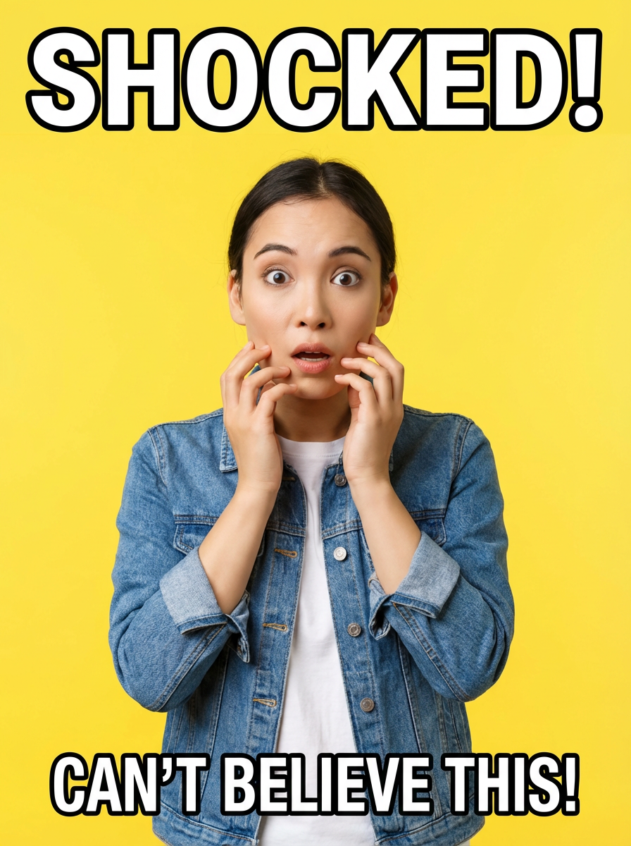 the image is a vibrant and colorful thumbnail, typically used for a youtube video. model with raised eyebrows and wide eyes, shocked expression, bright plain yellow background