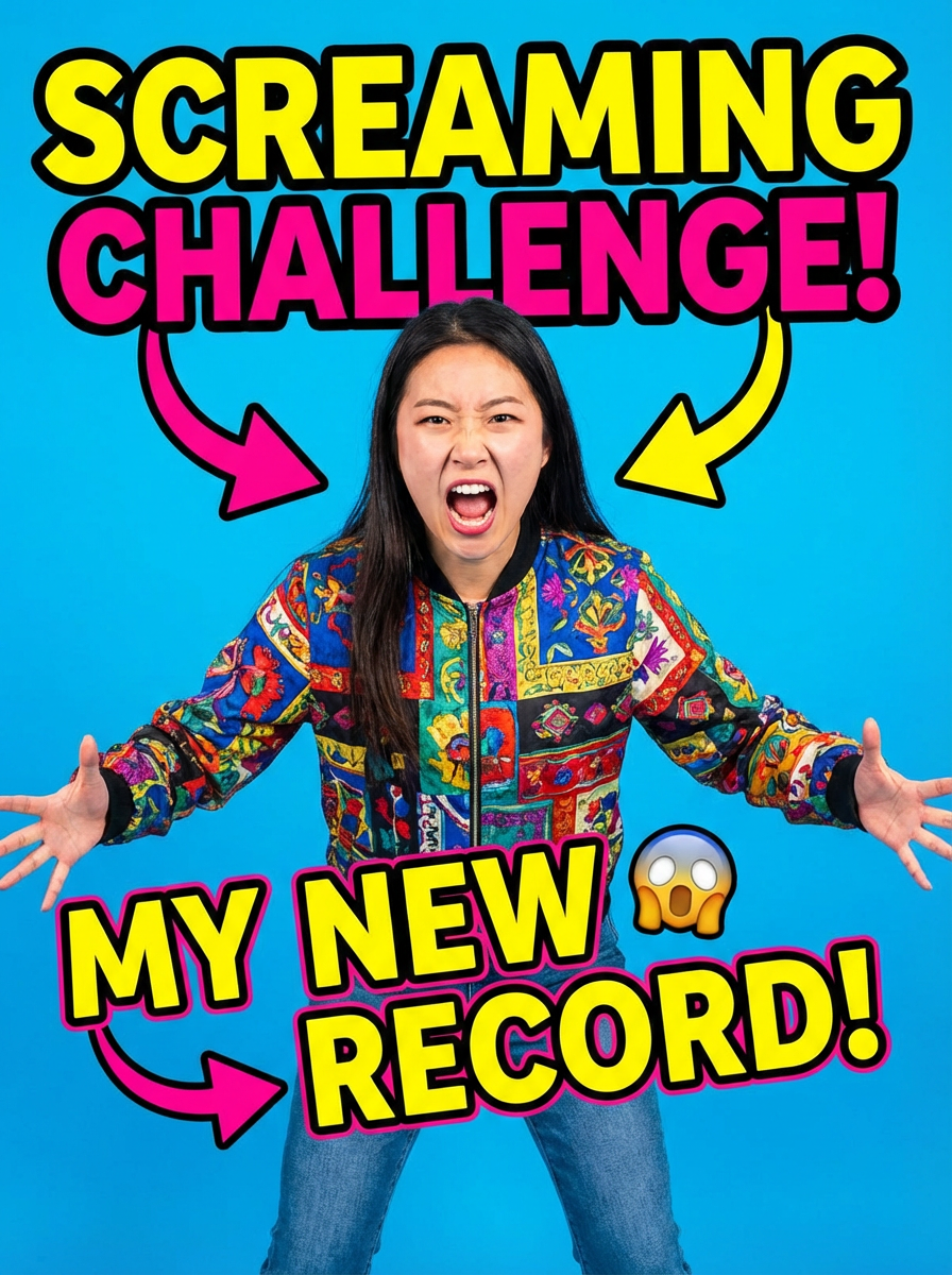 the image is a vibrant and colorful thumbnail, typically used for a youtube video. model with mouth wide open screaming yelling shouting, bright plain blue background