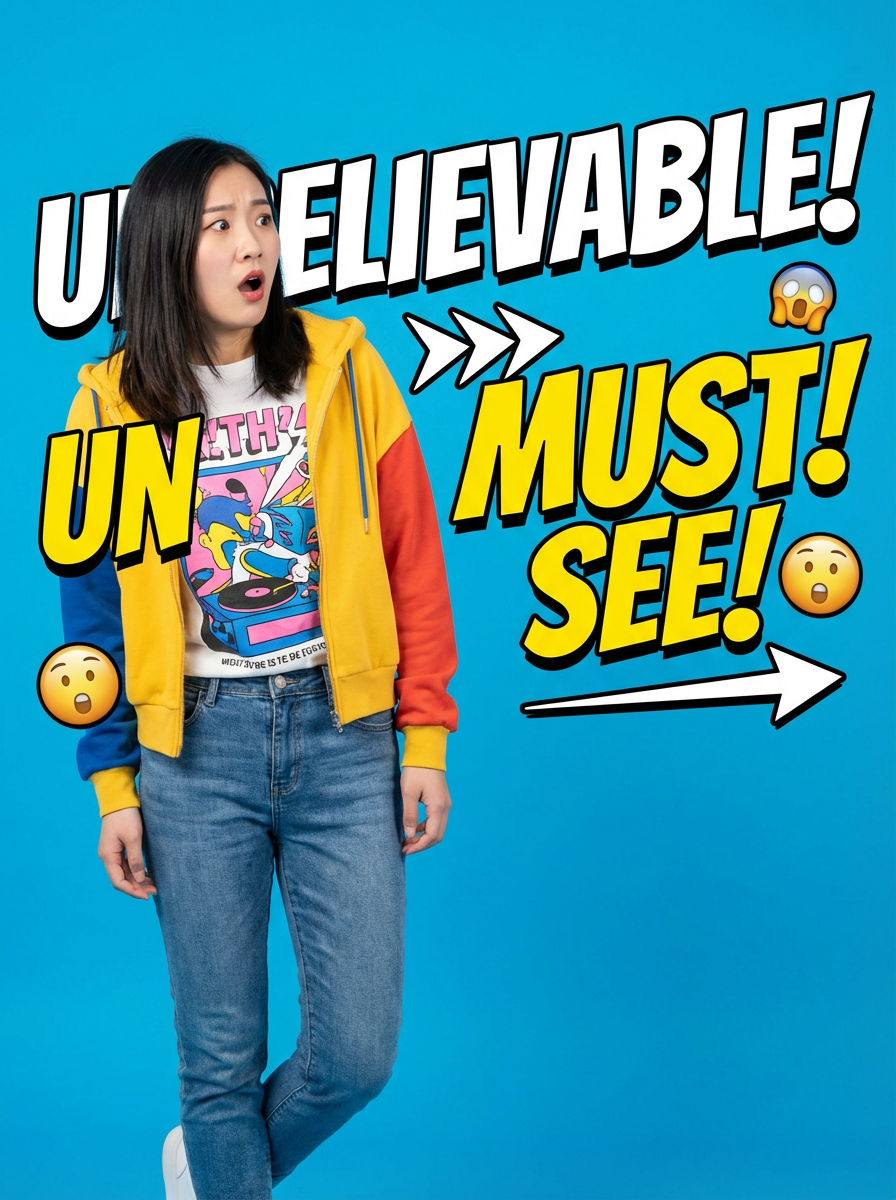 the image is a vibrant and colorful thumbnail, typically used for a youtube video. model looking left with shocked expression, bright plain blue background