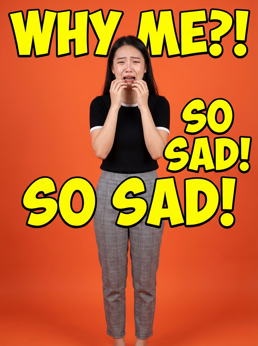 the image is a vibrant and colorful thumbnail, typically used for a youtube video. exaggerated crying model, bright plain orange background