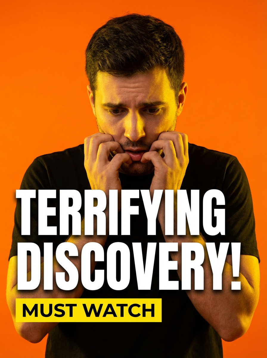 the image is a vibrant and colorful thumbnail, typically used for a youtube video. model looking down with scared face, bright plain orange background