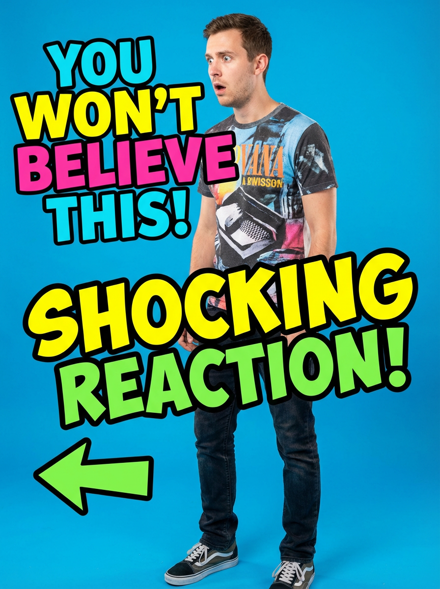 the image is a vibrant and colorful thumbnail, typically used for a youtube video. model looking left with shocked expression, bright plain blue background