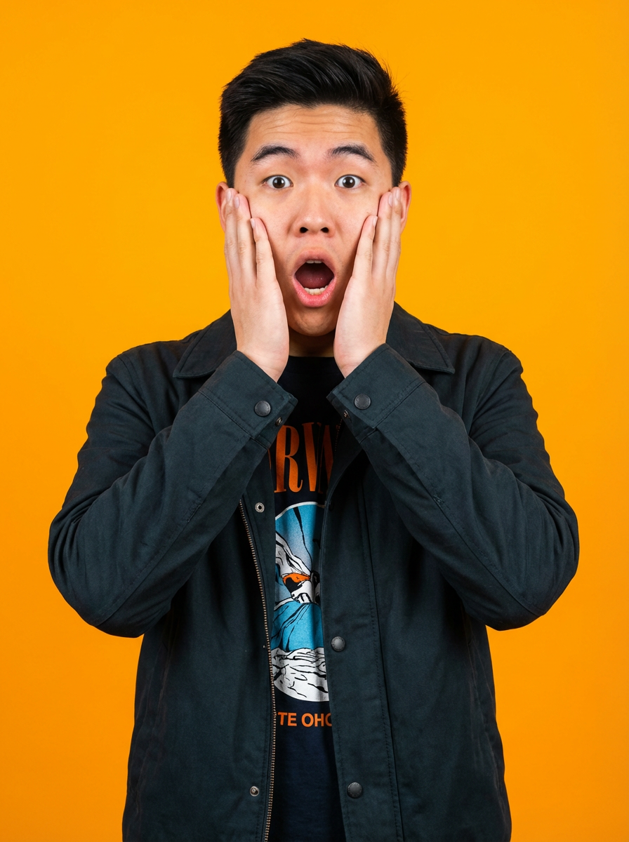 the image is a vibrant and colorful thumbnail, typically used for a youtube video. model with hands on cheeks, oh my god expression, bright plain orange background