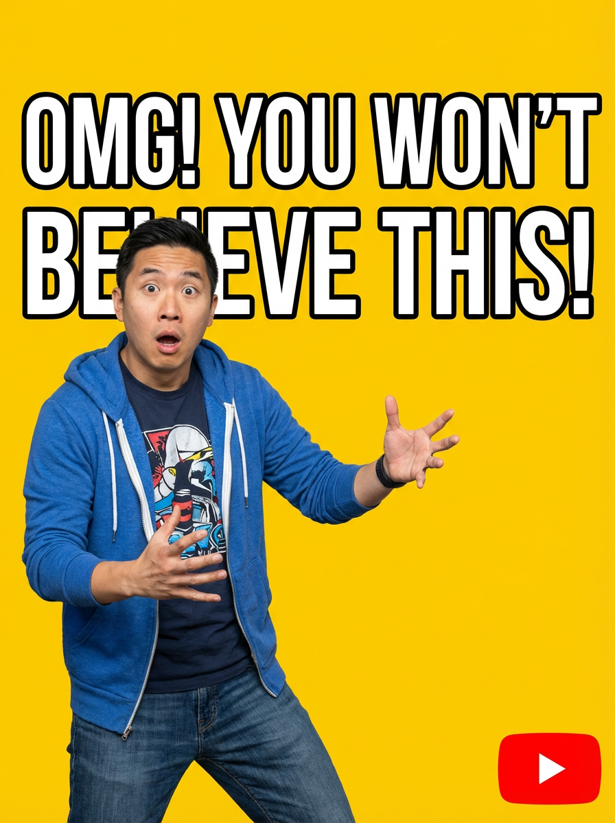 the image is a vibrant and colorful thumbnail, typically used for a youtube video. model with raised eyebrows and wide eyes, shocked expression, bright plain yellow background