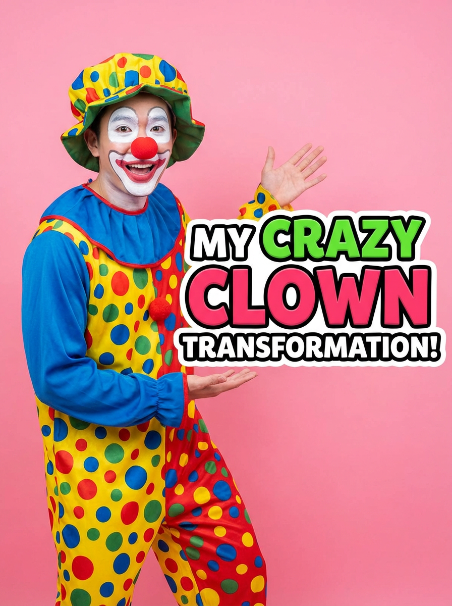 the image is a vibrant and colorful thumbnail, typically used for a youtube video. model as Clown with Clown Makeup, bright plain pink background