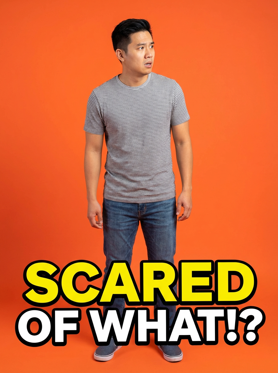 the image is a vibrant and colorful thumbnail, typically used for a youtube video. model looking right with scared face, bright plain orange background