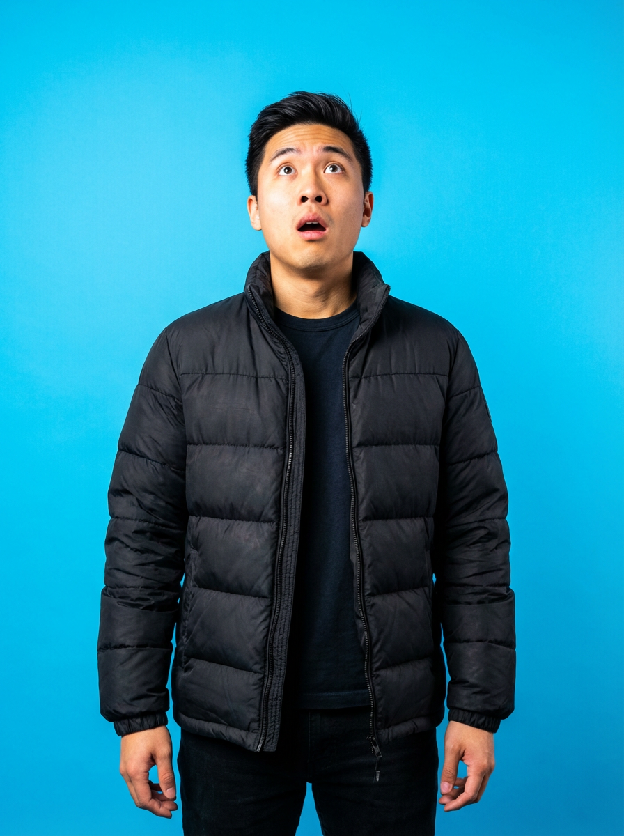 the image is a vibrant and colorful thumbnail, typically used for a youtube video. model looking up with shocked expression, bright plain blue background