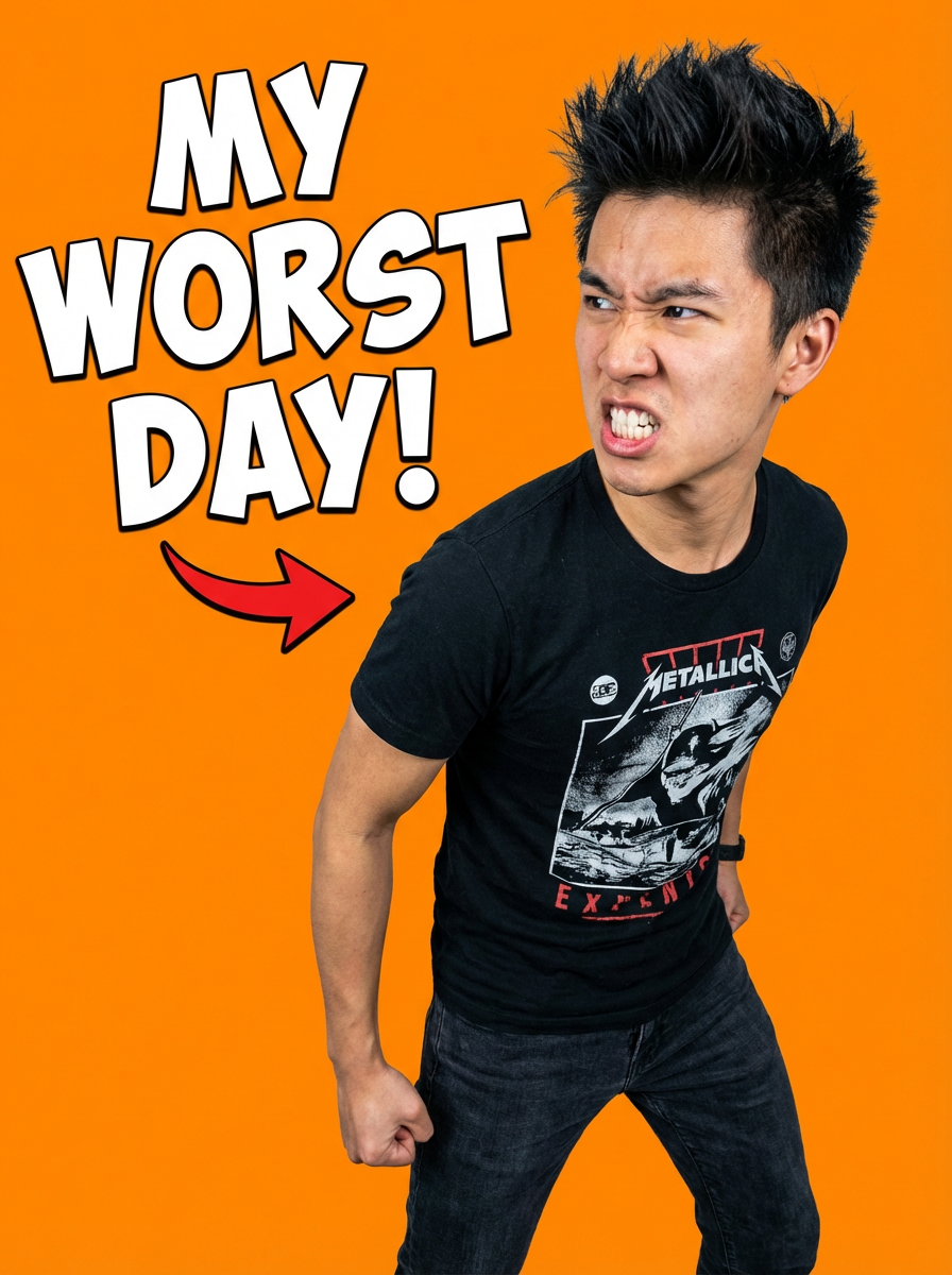the image is a vibrant and colorful thumbnail, typically used for a youtube video. model looking left with angry expression, bright plain orange background