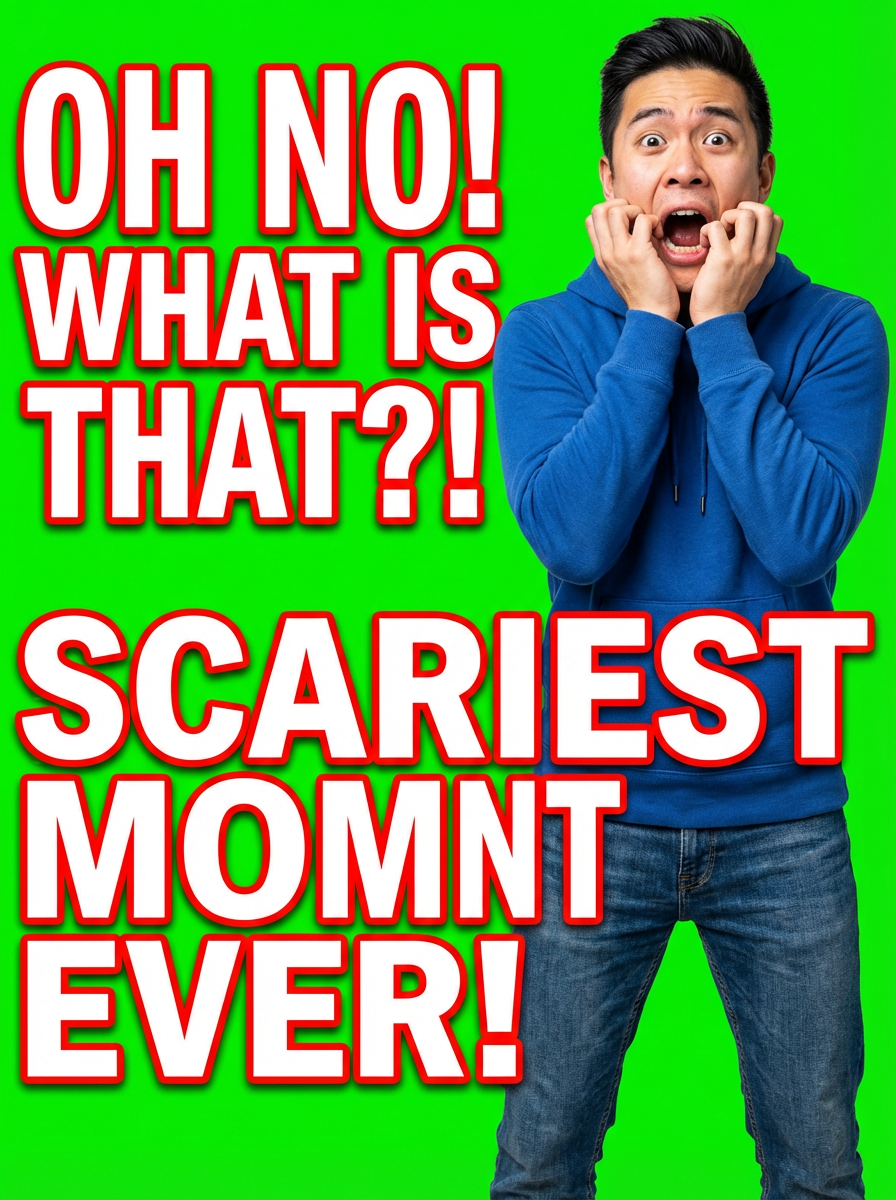 the image is a vibrant and colorful thumbnail, typically used for a youtube video. exaggerated scared shocked afraid frightened terrified anxious model, bright plain green background