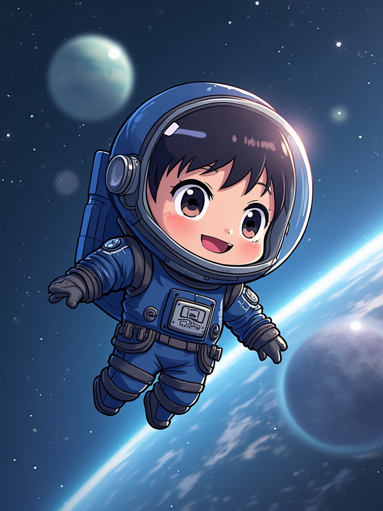 The model as a chibi astronaut floating in space, wearing a blue space suit with a shiny helmet. The background is a galaxy with planets and stars. The style is in cute chibi anime illustration.