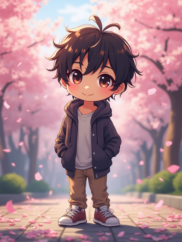The model as a chibi character standing on a peaceful Japanese street during cherry blossom season, wearing a casual streetwear outfit with a hoodie and sneakers. The background is filled with pink petals and soft sunlight. Highly detailed chibi-style rendering with vibrant colors and a magical atmosphere.