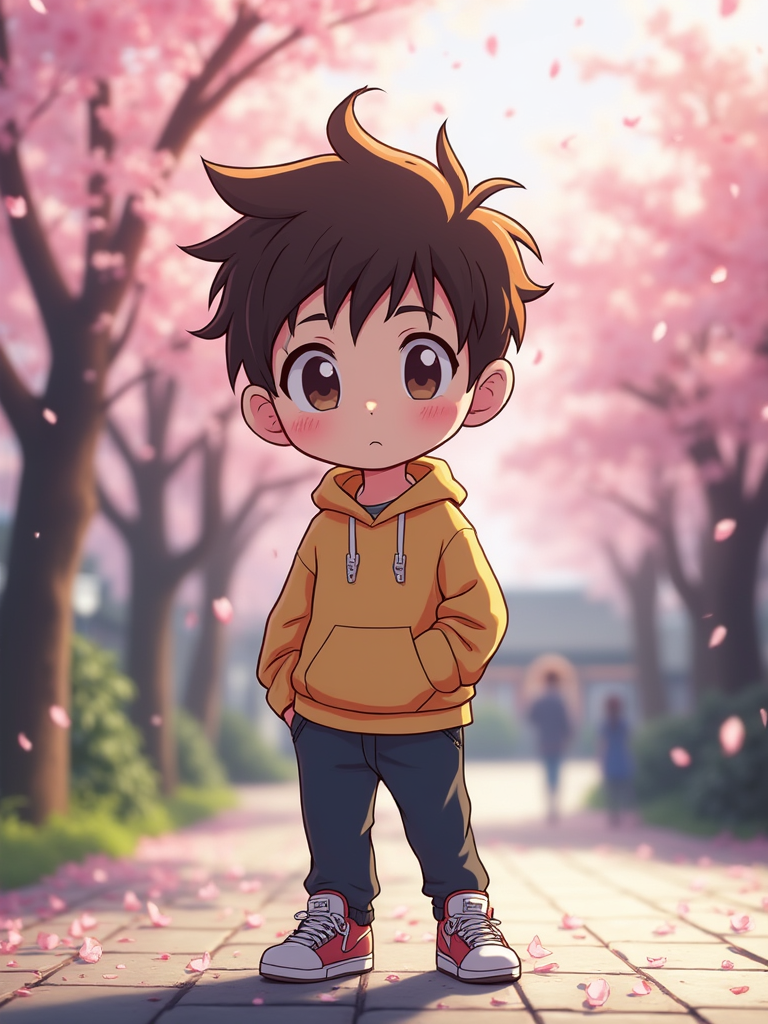 The model as a chibi character standing on a peaceful Japanese street during cherry blossom season, wearing a casual streetwear outfit with a hoodie and sneakers. The background is filled with pink petals and soft sunlight. Highly detailed chibi-style rendering with vibrant colors and a magical atmosphere.