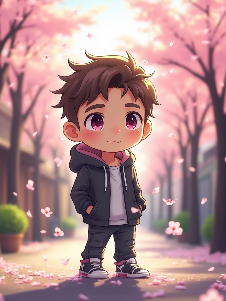 The model as a chibi character standing on a peaceful Japanese street during cherry blossom season, wearing a casual streetwear outfit with a hoodie and sneakers. The background is filled with pink petals and soft sunlight. Highly detailed chibi-style rendering with vibrant colors and a magical atmosphere.