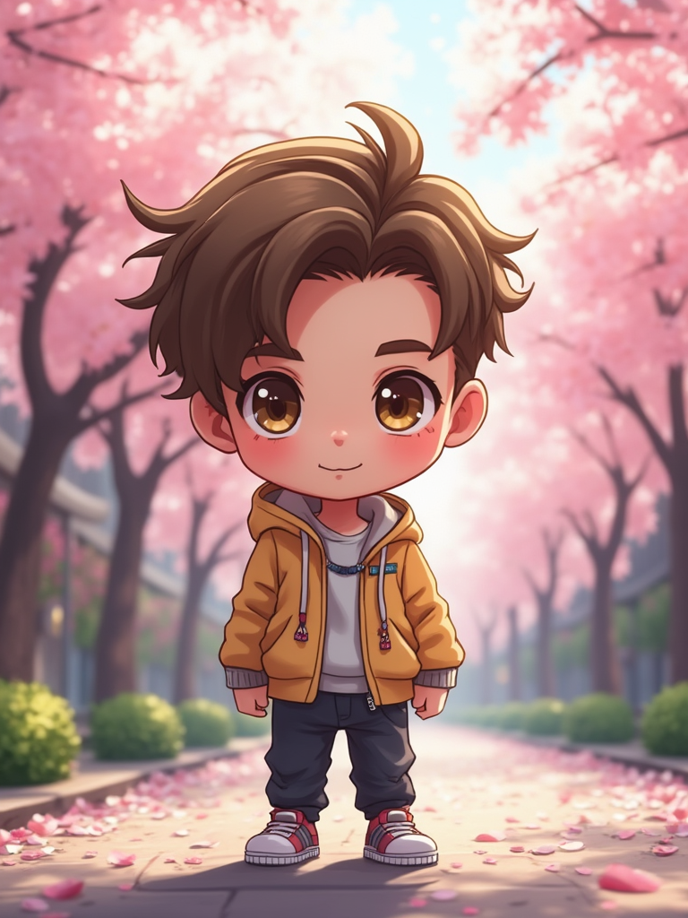 The model as a chibi character standing on a peaceful Japanese street during cherry blossom season, wearing a casual streetwear outfit with a hoodie and sneakers. The background is filled with pink petals and soft sunlight. Highly detailed chibi-style rendering with vibrant colors and a magical atmosphere.