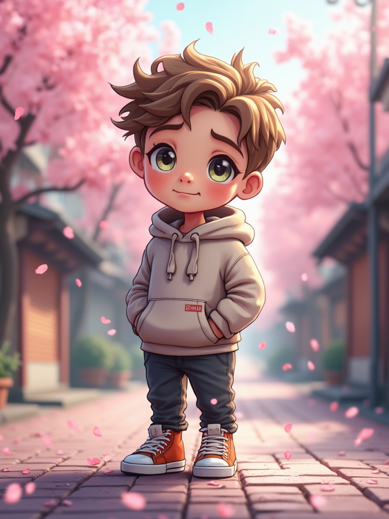 The model as a chibi character standing on a peaceful Japanese street during cherry blossom season, wearing a casual streetwear outfit with a hoodie and sneakers. The background is filled with pink petals and soft sunlight. Highly detailed chibi-style rendering with vibrant colors and a magical atmosphere.
