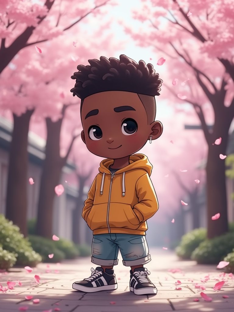 The model as a chibi character standing on a peaceful Japanese street during cherry blossom season, wearing a casual streetwear outfit with a hoodie and sneakers. The background is filled with pink petals and soft sunlight. Highly detailed chibi-style rendering with vibrant colors and a magical atmosphere.