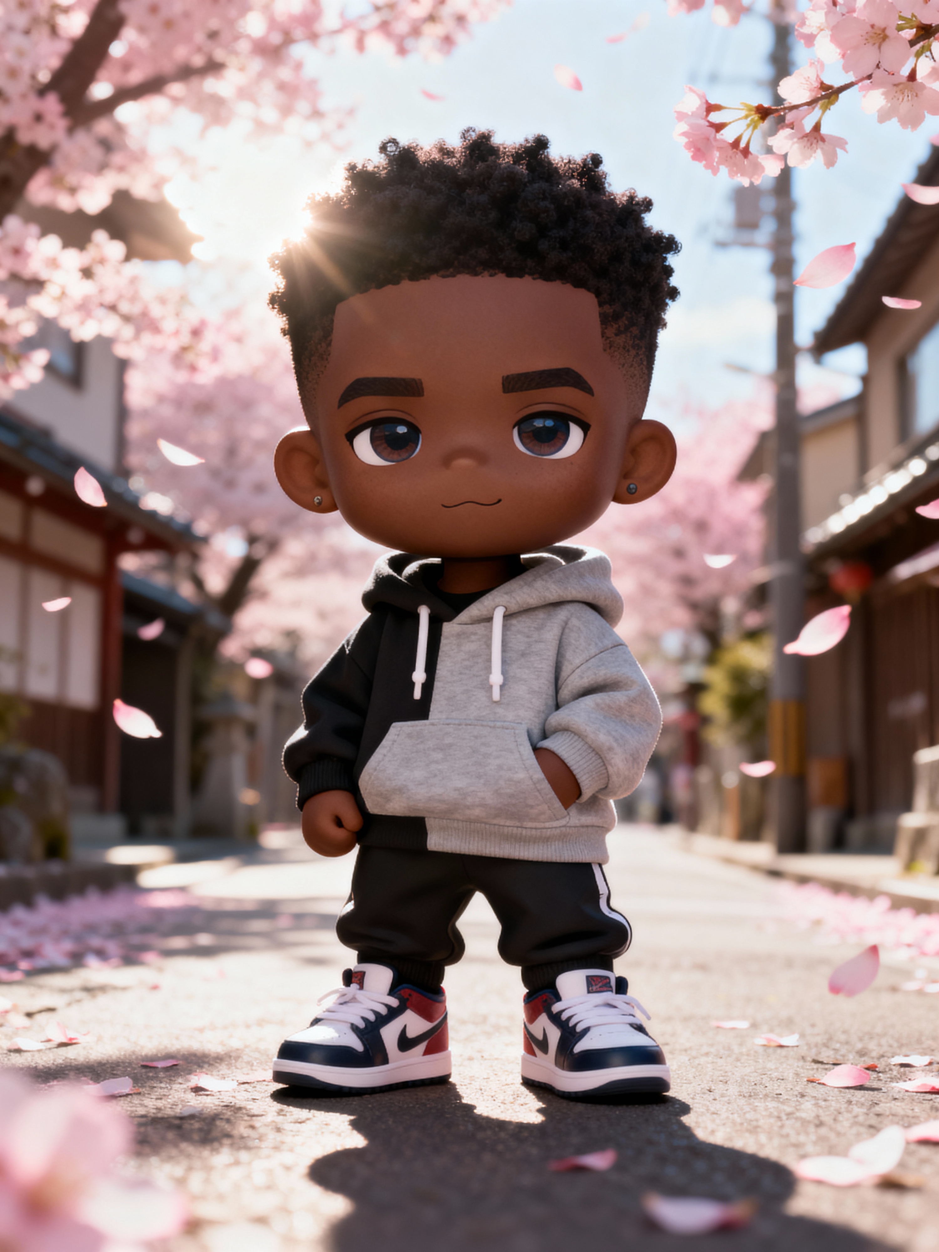 The model as a chibi character standing on a peaceful Japanese street during cherry blossom season, wearing a casual streetwear outfit with a hoodie and sneakers. The background is filled with pink petals and soft sunlight. Highly detailed chibi-style rendering with vibrant colors and a magical atmosphere.