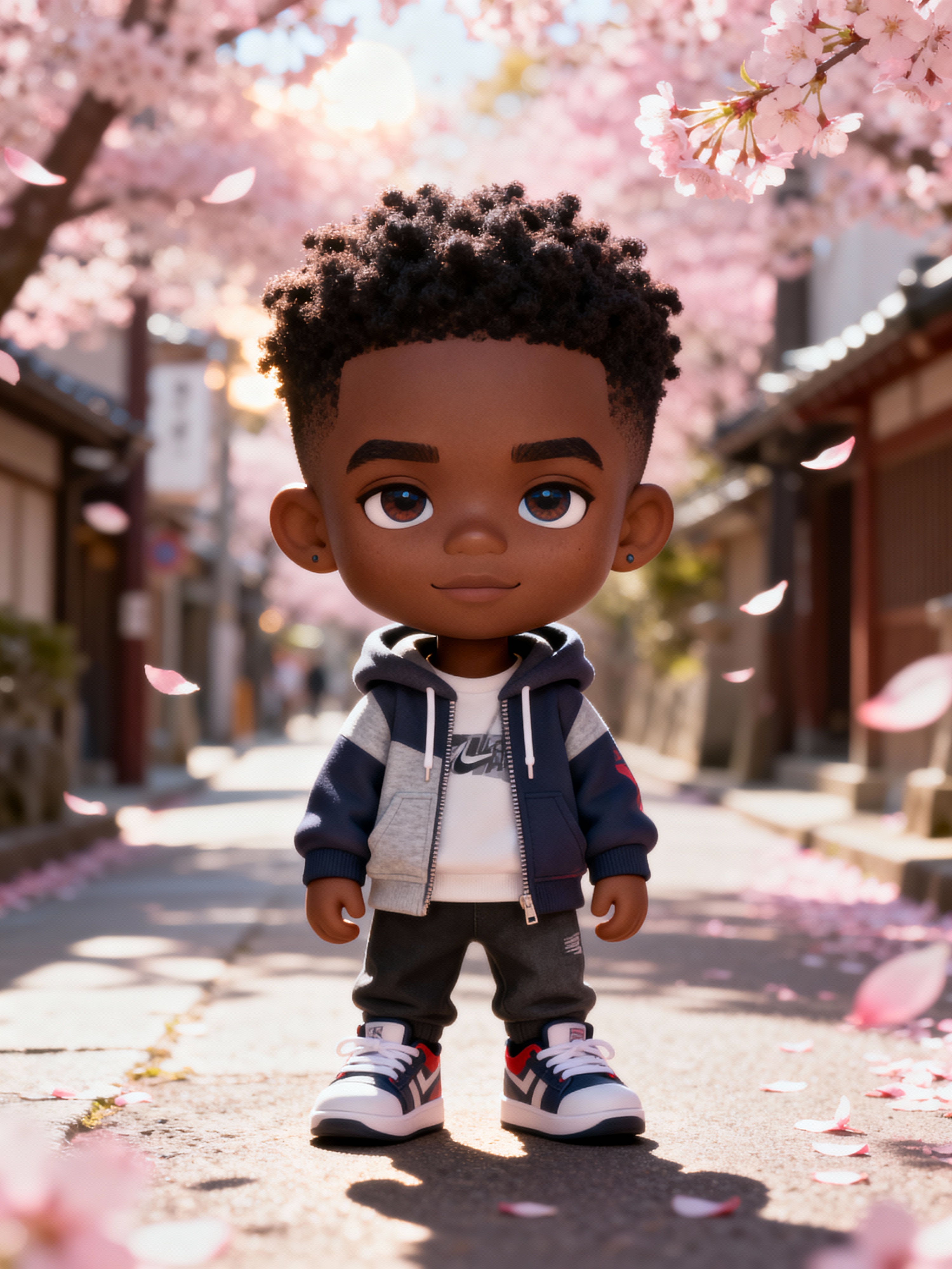 The model as a chibi character standing on a peaceful Japanese street during cherry blossom season, wearing a casual streetwear outfit with a hoodie and sneakers. The background is filled with pink petals and soft sunlight. Highly detailed chibi-style rendering with vibrant colors and a magical atmosphere.