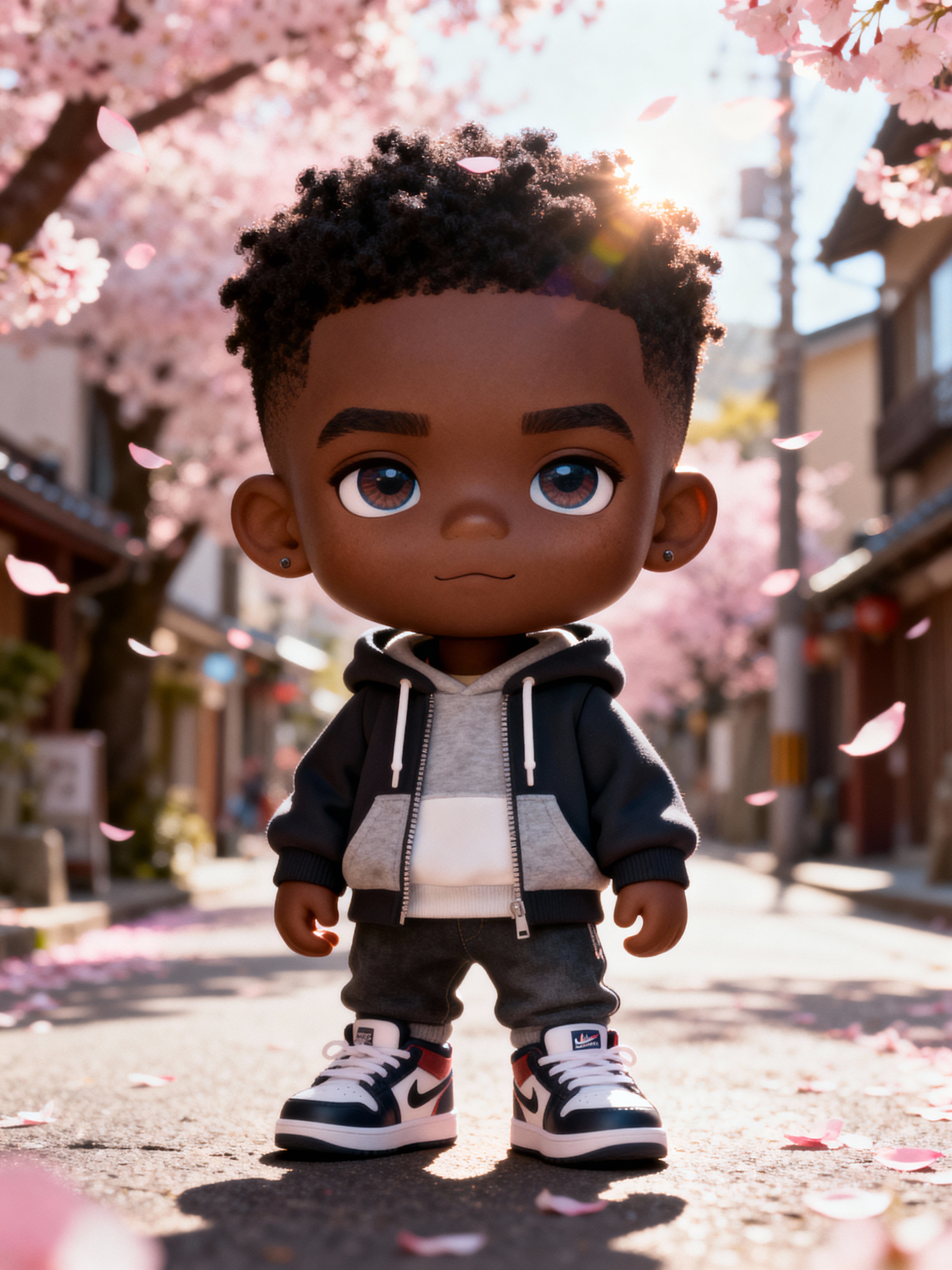 The model as a chibi character standing on a peaceful Japanese street during cherry blossom season, wearing a casual streetwear outfit with a hoodie and sneakers. The background is filled with pink petals and soft sunlight. Highly detailed chibi-style rendering with vibrant colors and a magical atmosphere.