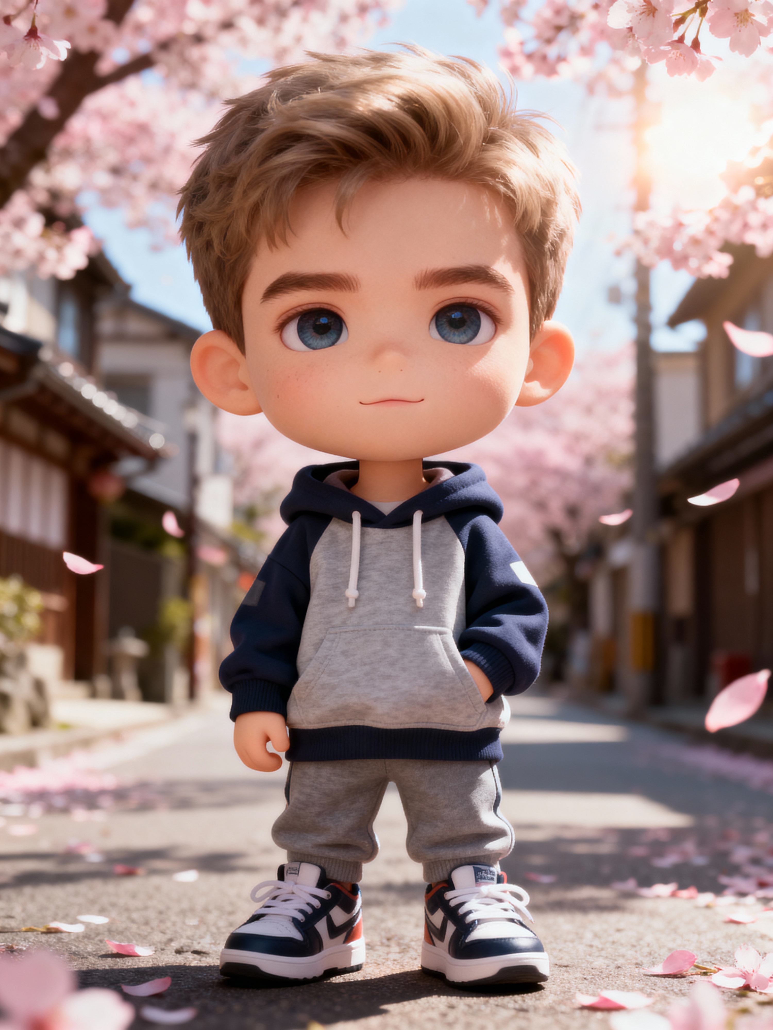The model as a chibi character standing on a peaceful Japanese street during cherry blossom season, wearing a casual streetwear outfit with a hoodie and sneakers. The background is filled with pink petals and soft sunlight. Highly detailed chibi-style rendering with vibrant colors and a magical atmosphere.