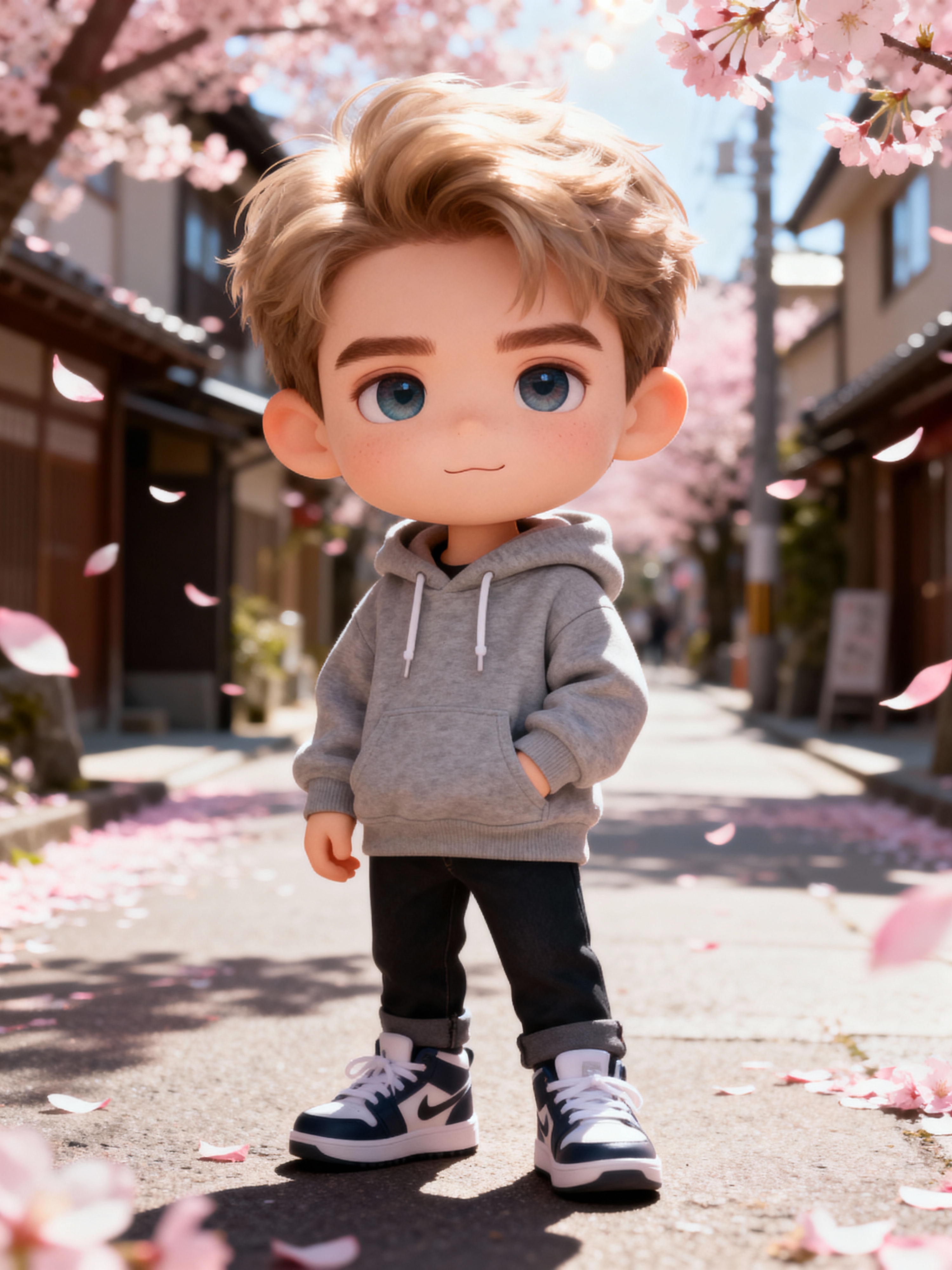 The model as a chibi character standing on a peaceful Japanese street during cherry blossom season, wearing a casual streetwear outfit with a hoodie and sneakers. The background is filled with pink petals and soft sunlight. Highly detailed chibi-style rendering with vibrant colors and a magical atmosphere.