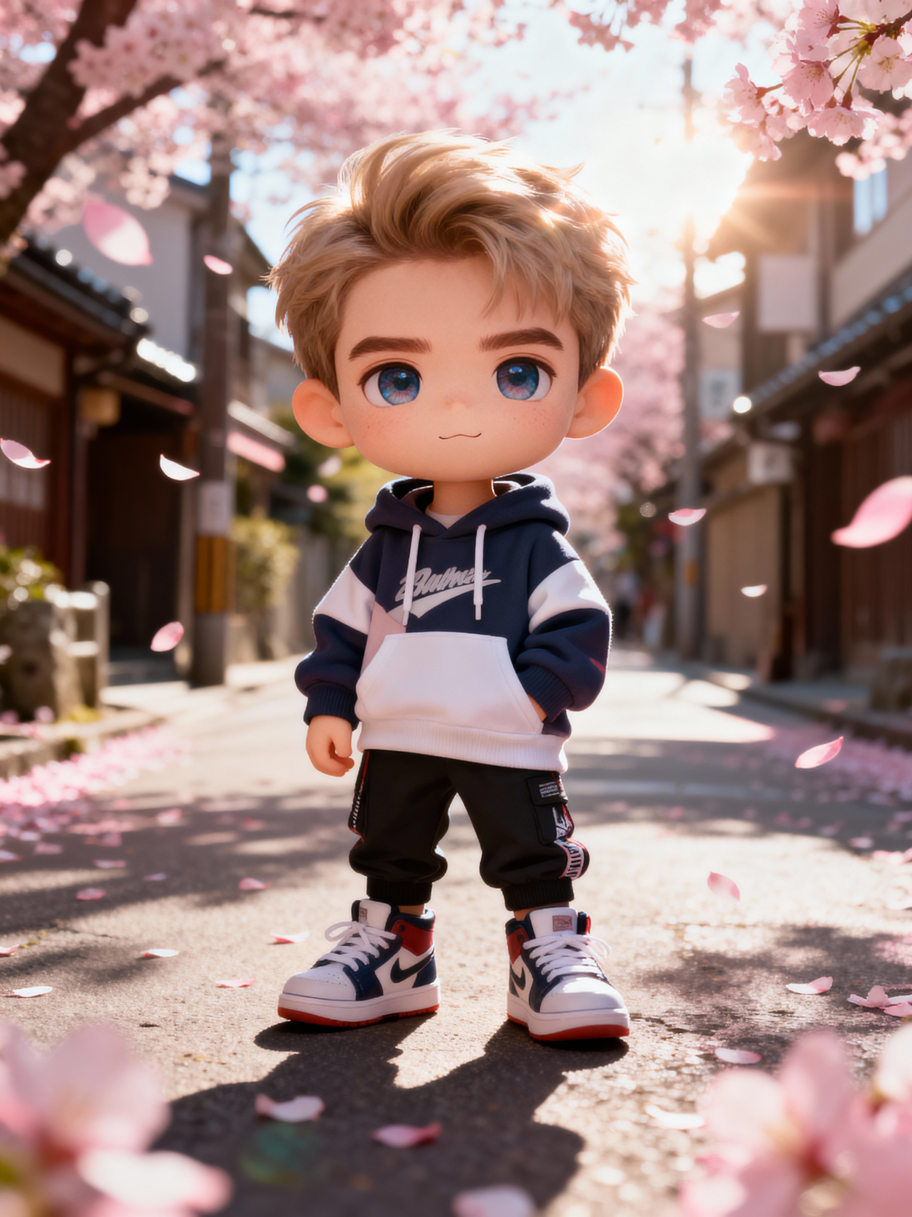 The model as a chibi character standing on a peaceful Japanese street during cherry blossom season, wearing a casual streetwear outfit with a hoodie and sneakers. The background is filled with pink petals and soft sunlight. Highly detailed chibi-style rendering with vibrant colors and a magical atmosphere.