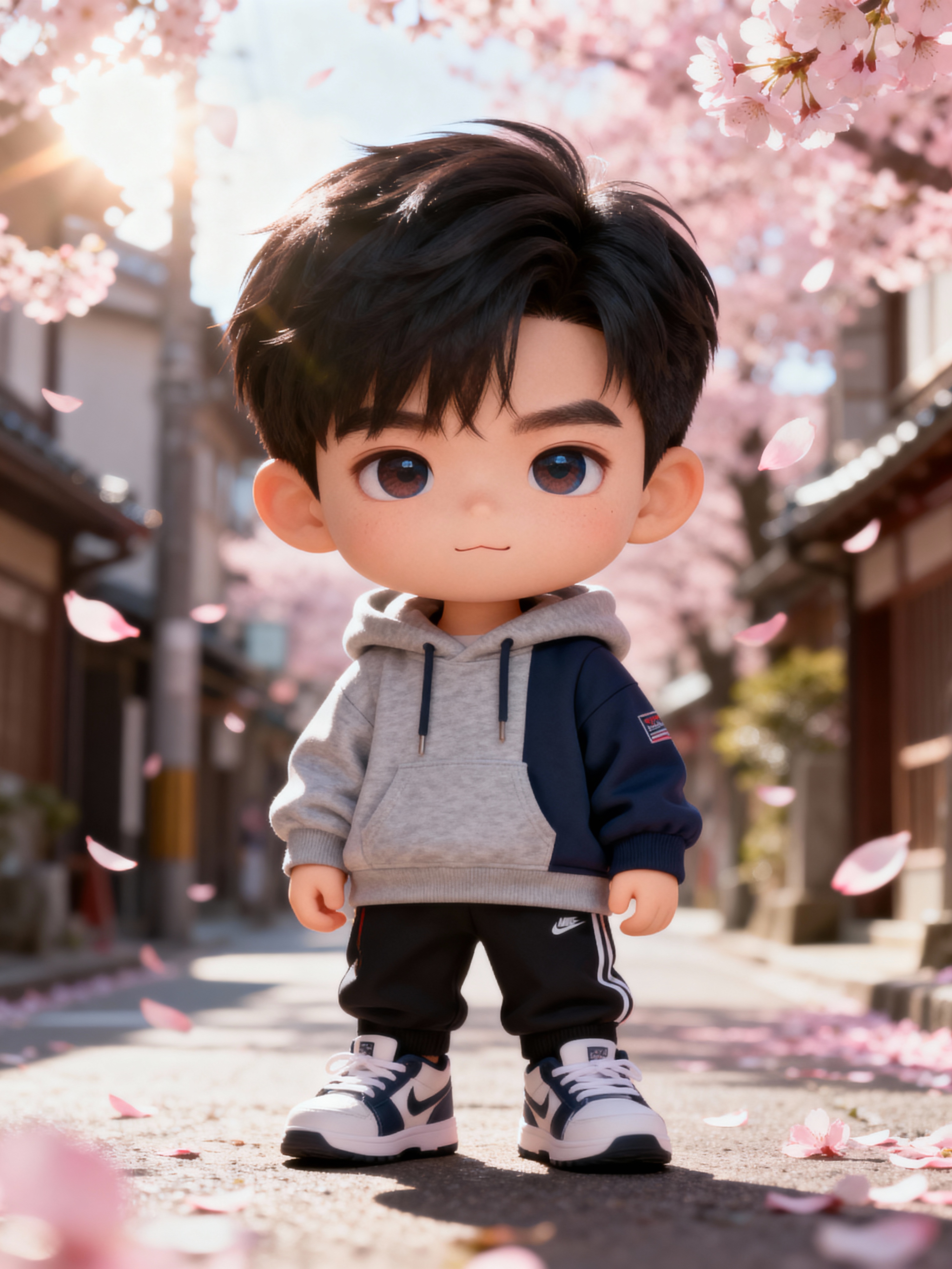 The model as a chibi character standing on a peaceful Japanese street during cherry blossom season, wearing a casual streetwear outfit with a hoodie and sneakers. The background is filled with pink petals and soft sunlight. Highly detailed chibi-style rendering with vibrant colors and a magical atmosphere.